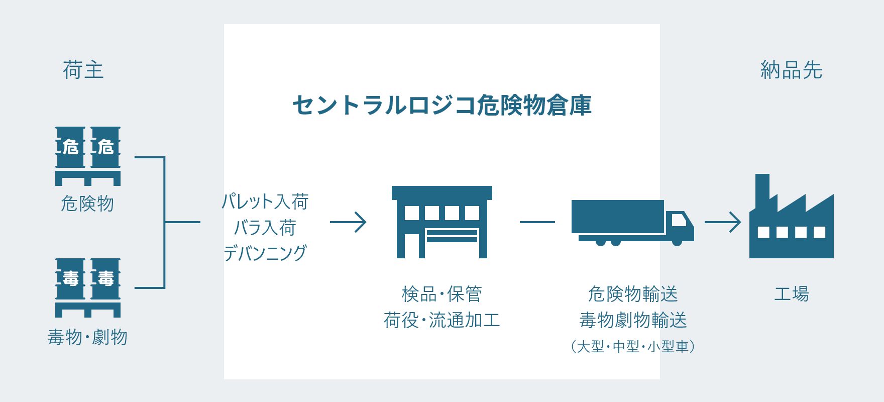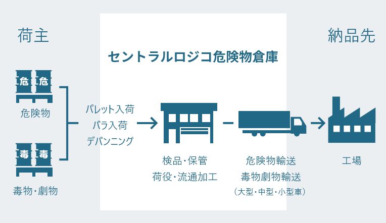 毒物及び劇物取締法では「毒物劇物一般販売業」の登録を受けていない倉庫業者は、「保管」「入出荷作業」「在庫管理」をすることはできないと定義されています。弊社は「保管」「入出荷作業」「在庫管理」の全てが行える、下記条件を満たしています。