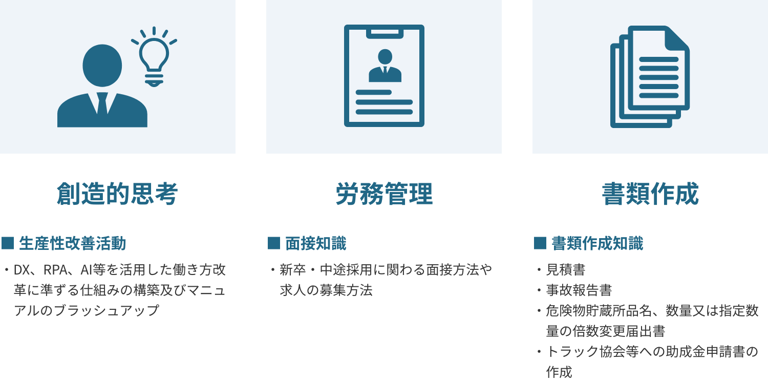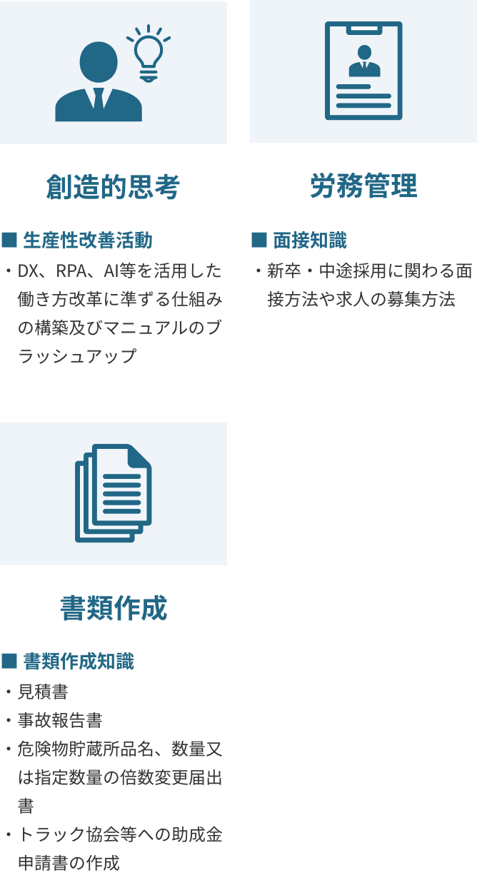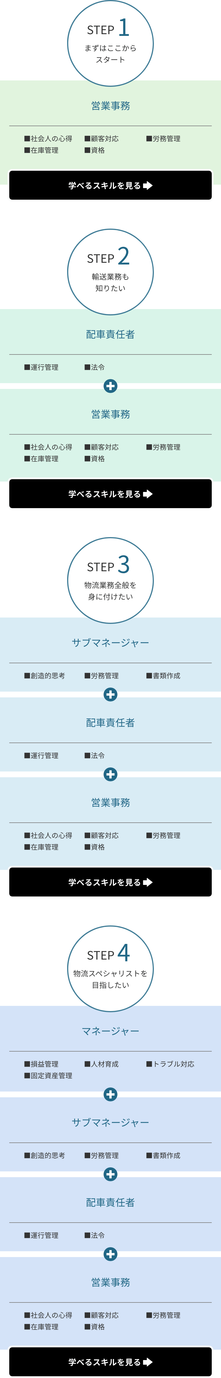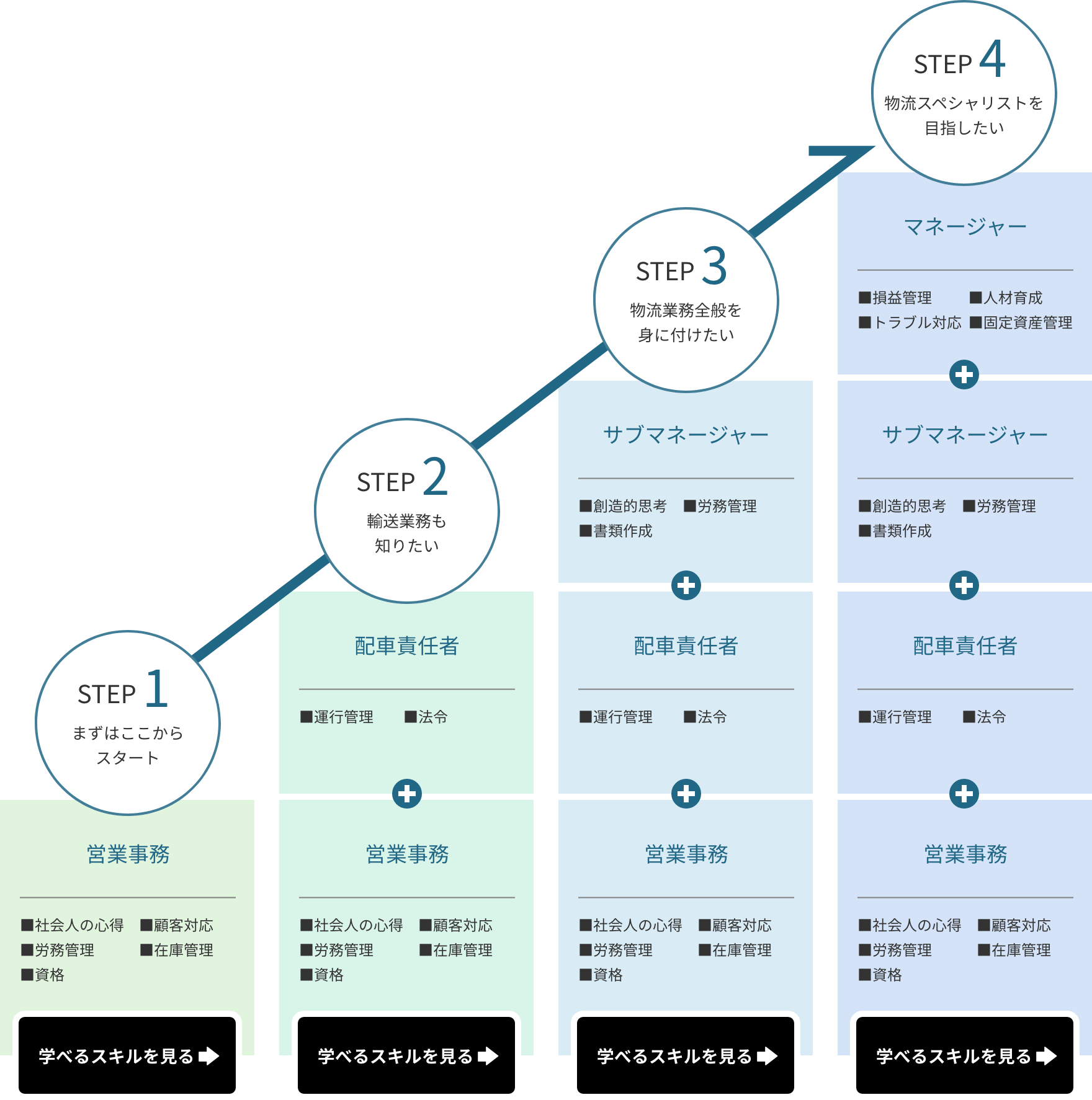 営業事務に始まり、配車や倉庫実務などとともに輸送知識を蓄え、マネージャーへとキャリアアップできます。マネージャーは物流のスペシャリストとして、全ての業務を行います。