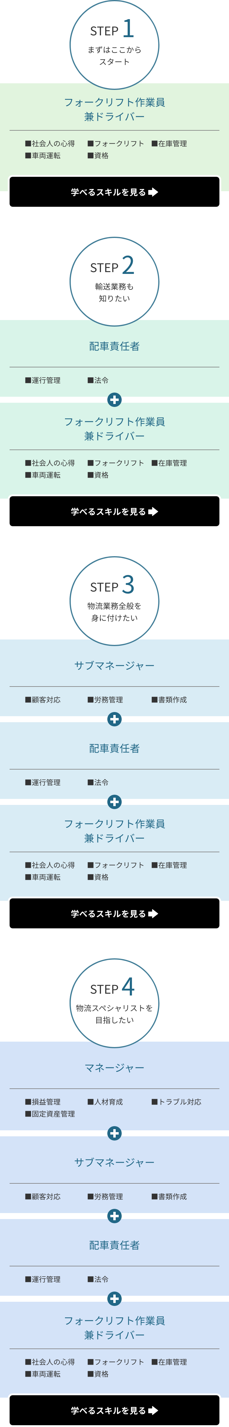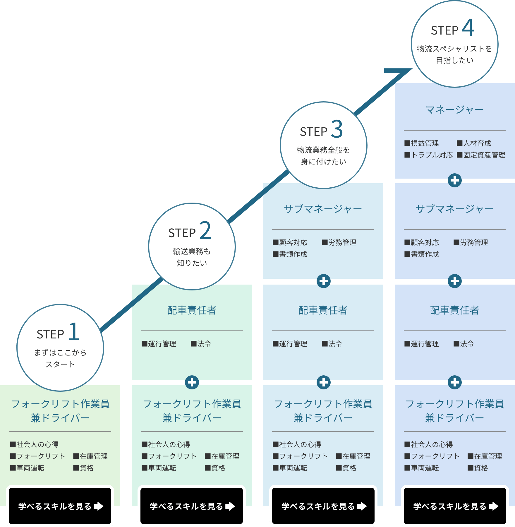 フォークリフトでの業務に始まり、運転手や営業事務などの顧客対応業務を経て、マネージャーへとキャリアアップできます。マネージャーは物流のスペシャリストとして、全ての業務を行います。